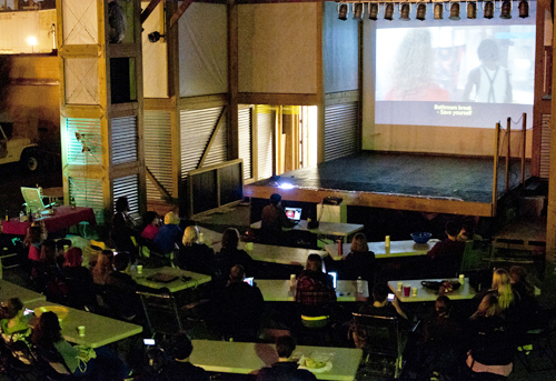 From a technical standpoint, TrashTalk Theater works by creating a local wireless network that links a web-based user interface with a custom movie playback and text rendering engine. Any device with a web browser, such as a laptop, a smartphone or a tablet computer can be used to send commentary directly to the screen as the movie is playing. The web interface may also be used to vote for basic transport controls like a brief rewind. But one person alone cannot initiate these events--they occur only if enough people agree and vote with you!
